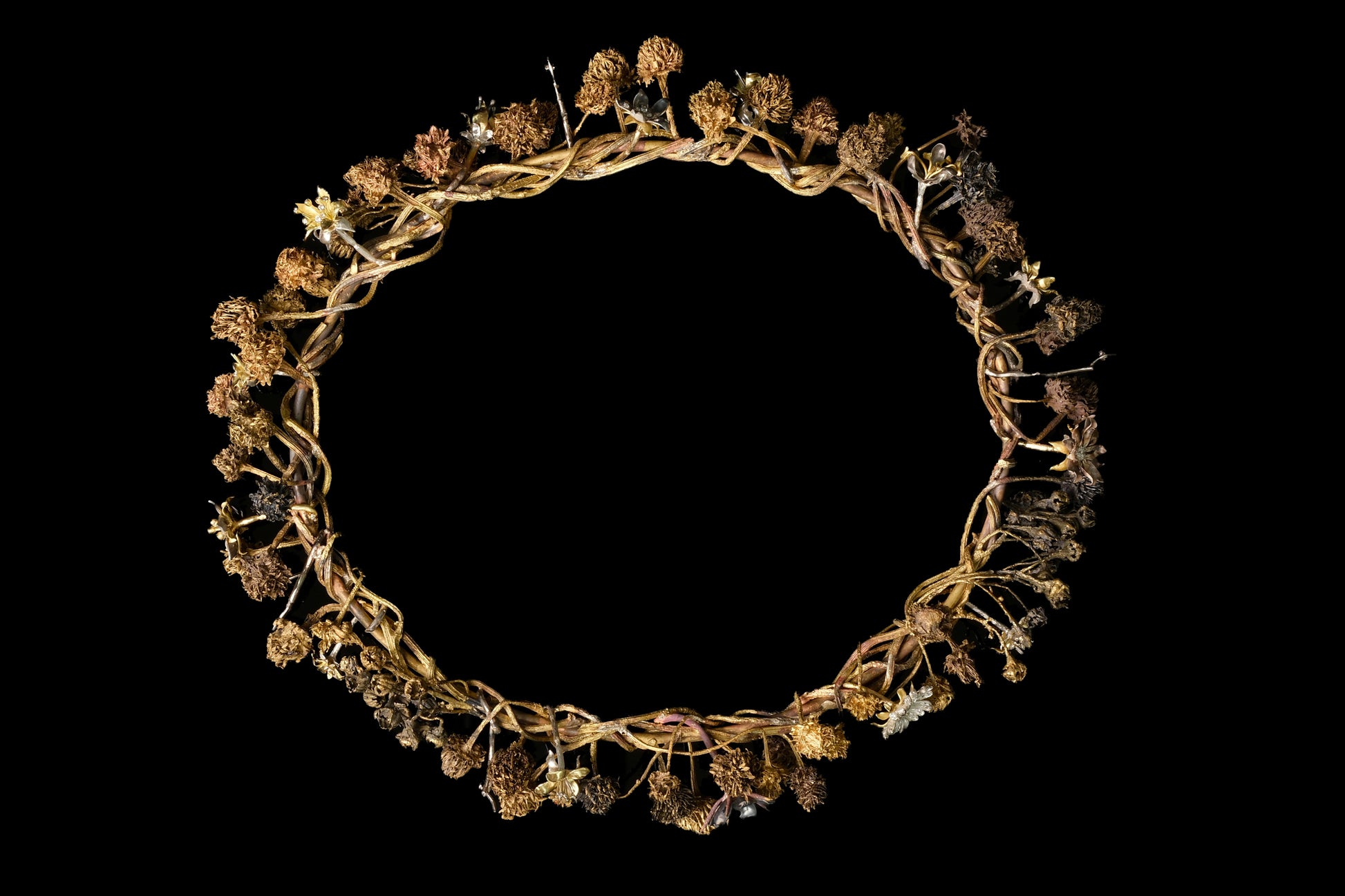 One-of-a-kind Flower wreath made of 18K yellow and palladium white Fairmined gold, Fairmined silver, brass and Ocean Diamonds from South Africa. This tiara was forged over 4 years, letting the brass oxidise and the handmade flowers shine in their idealised forms. Each details adds to the rich meaning of this piece, with a nod to reality and fantasies. The real echinacea contrasts with the hand-created flowers to bring some whimsy and give an edge to a beloved staple piece, such as the flower crown.