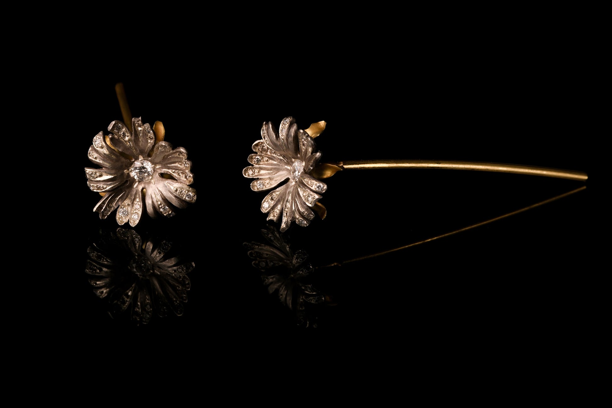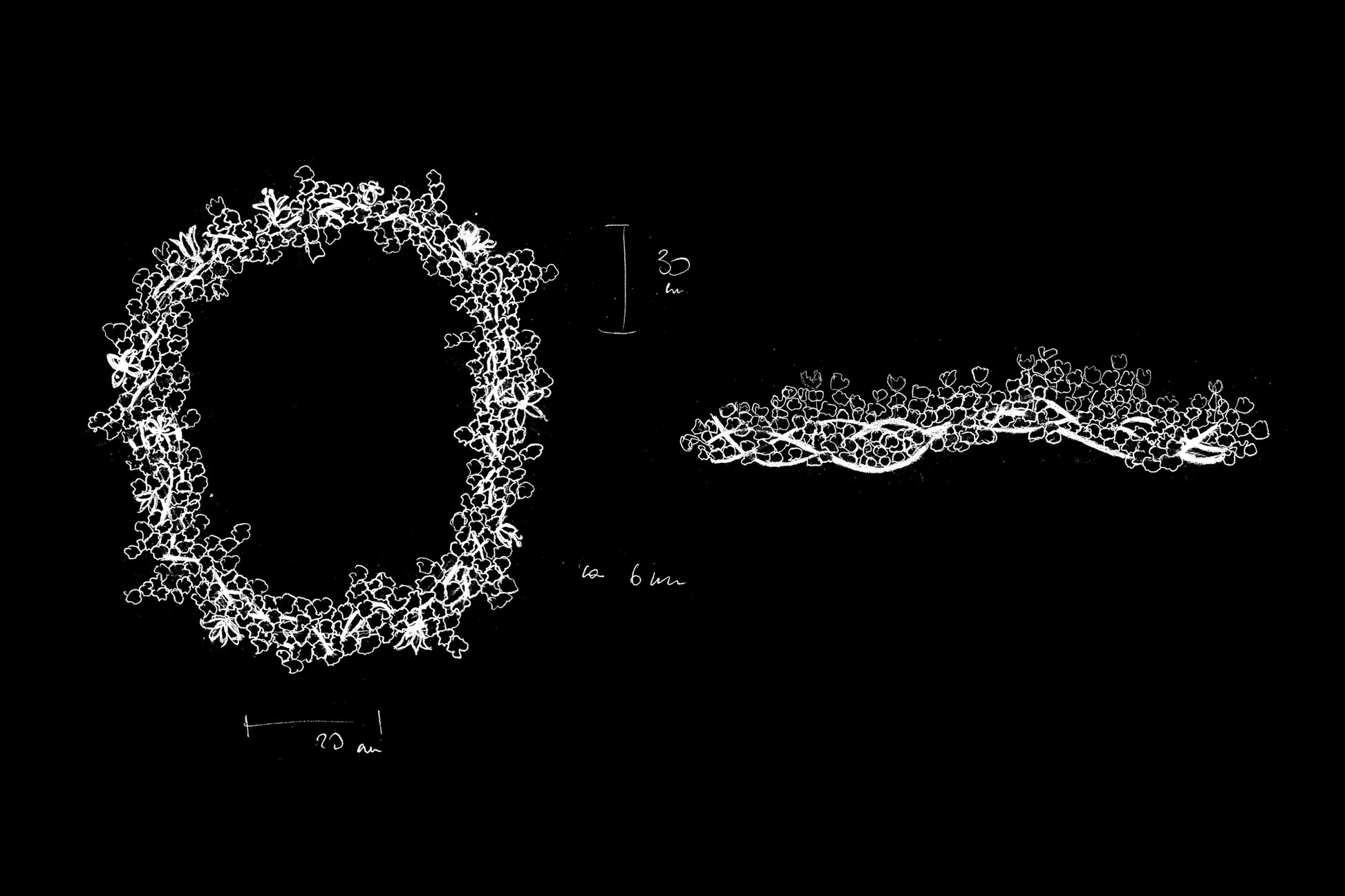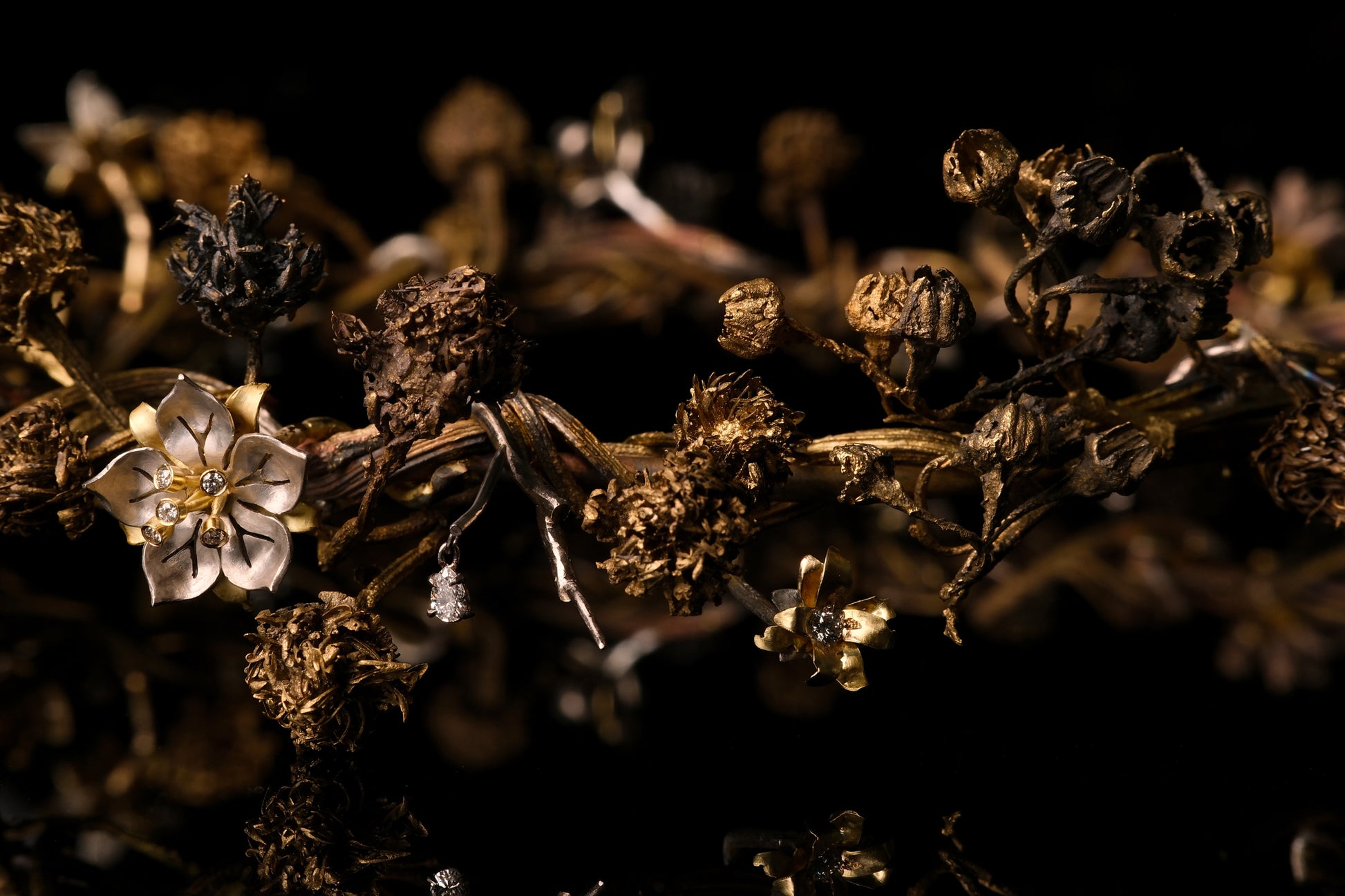 The creation of the Flower Wreath took 500 hours. Each Echinacea was handpicked, nature-cast, interlocked, and soldered to create the crown. Joy added 14 hand-forged one-of-a-kind flowers and 4 white gold branches with pear-shaped diamonds. Each was alloyed from Fairmined gold and Fairmined silver, palladium, and copper; then hand-milled, cut, hammered, shaped, and soldered. She set all 70 diamonds. The artificial flowers were positioned on the wreath, and polished or textured to achieve each’s individuality. In contrast, the Echinacea were left untouched, letting them oxidize during the making process.