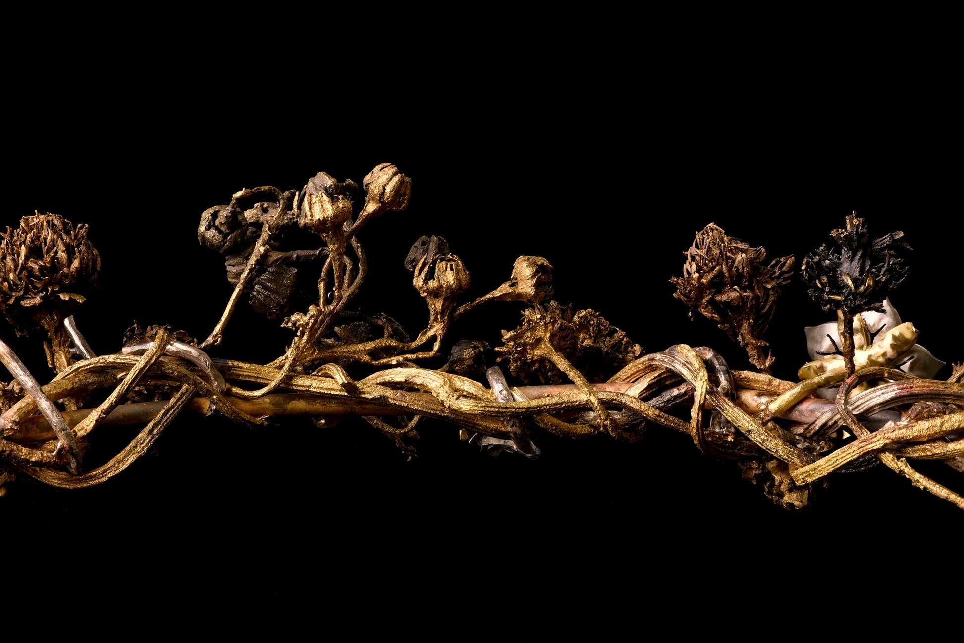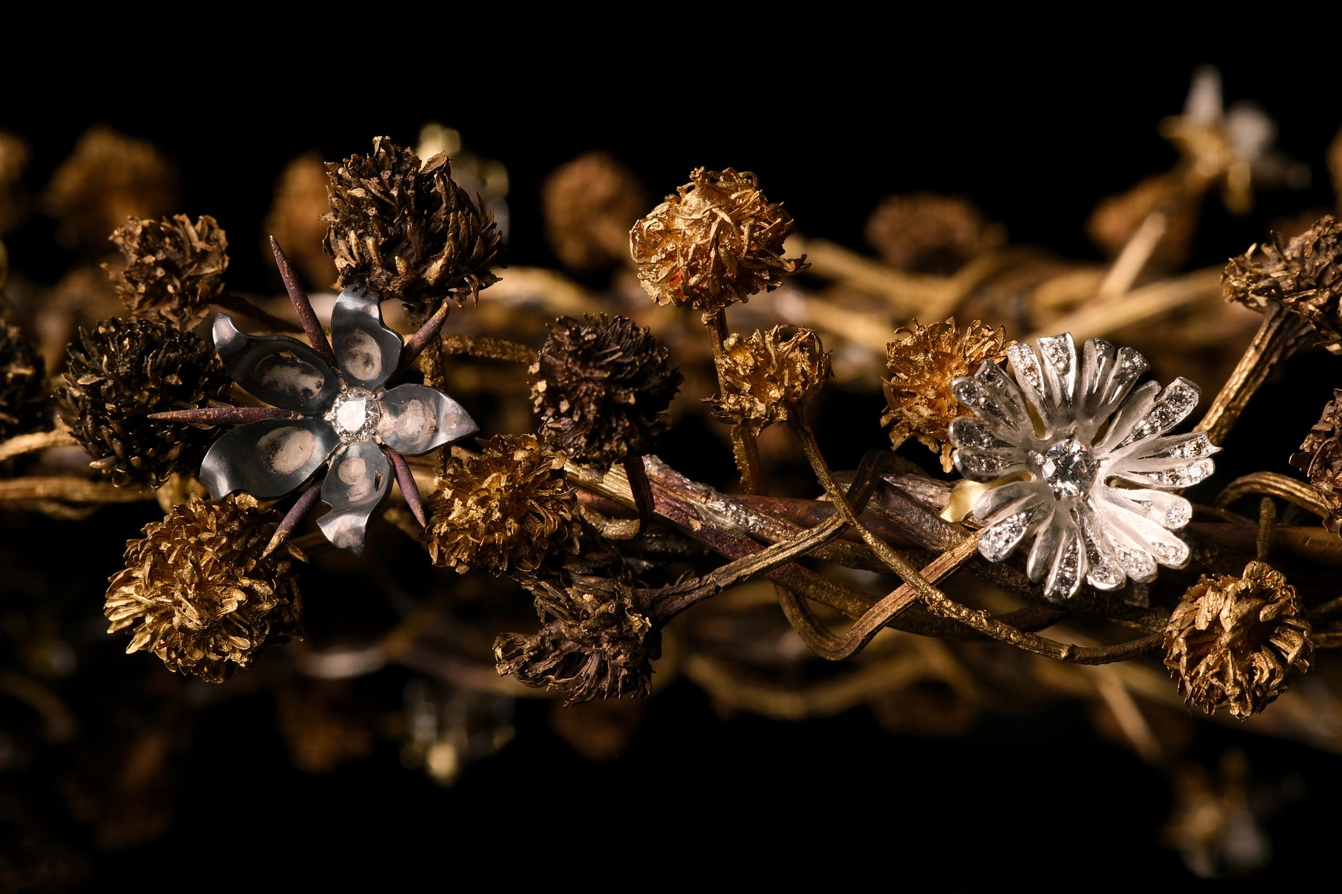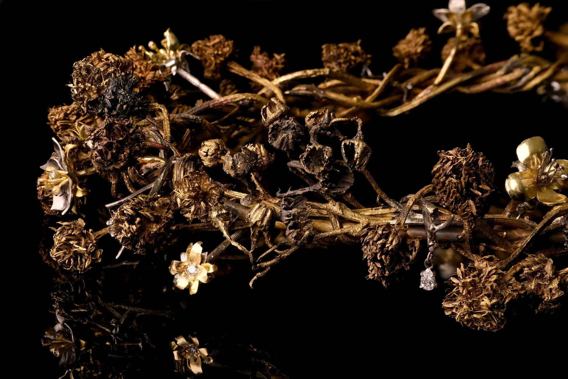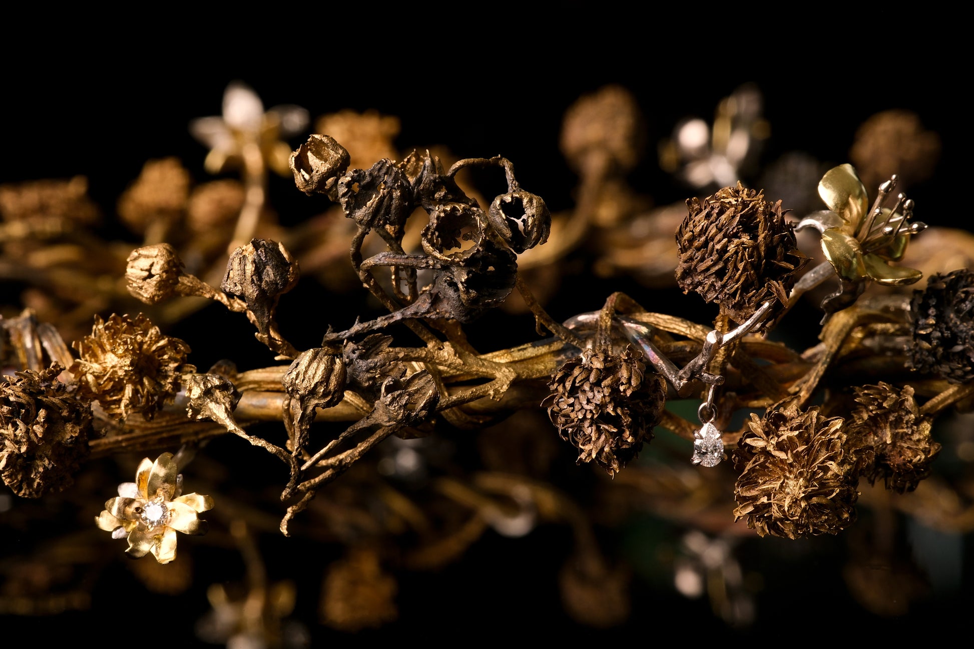 “I created this tiara as an escape from and celebration of womanhood, contrasting perfect, idealised, golden flowers and dead, real, brass ones. Here, youth, viewed as an idyllic period of life, is depicted as beautiful, superficial, and artificial. The nature-cast Echinacea, made of a cheaper material, serve both as a frame for the diamond-studded flowers and as their roots, being soldered together. While the gold of the former will forever represent bucolic dreams of youth, the brass of the latter will develop patinas, oxidations, and scratches. In other words, it will become more sophisticated and, - gain depth - it will age. Both time-bound reality and romanticised memories, shape our present, in an unachievable balance to accept each moment”